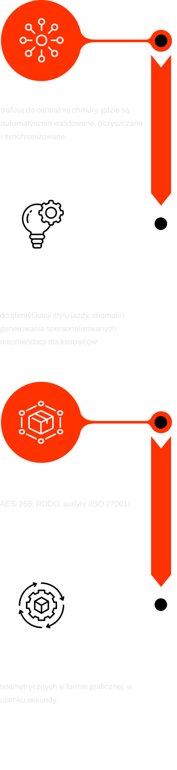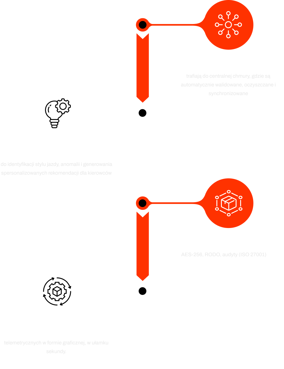 Dane z urządzeń OBD2 trafiają do centralnej chmury, gdzie są automatycznie walidowane, oczyszczane i synchronizowane — również w przypadku opóźnień lub braków transmisji. System wykorzystuje Machine Learning do identyfikacji stylu jazdy, anomalii i generowania spersonalizowanych rekomendacji dla kierowców.