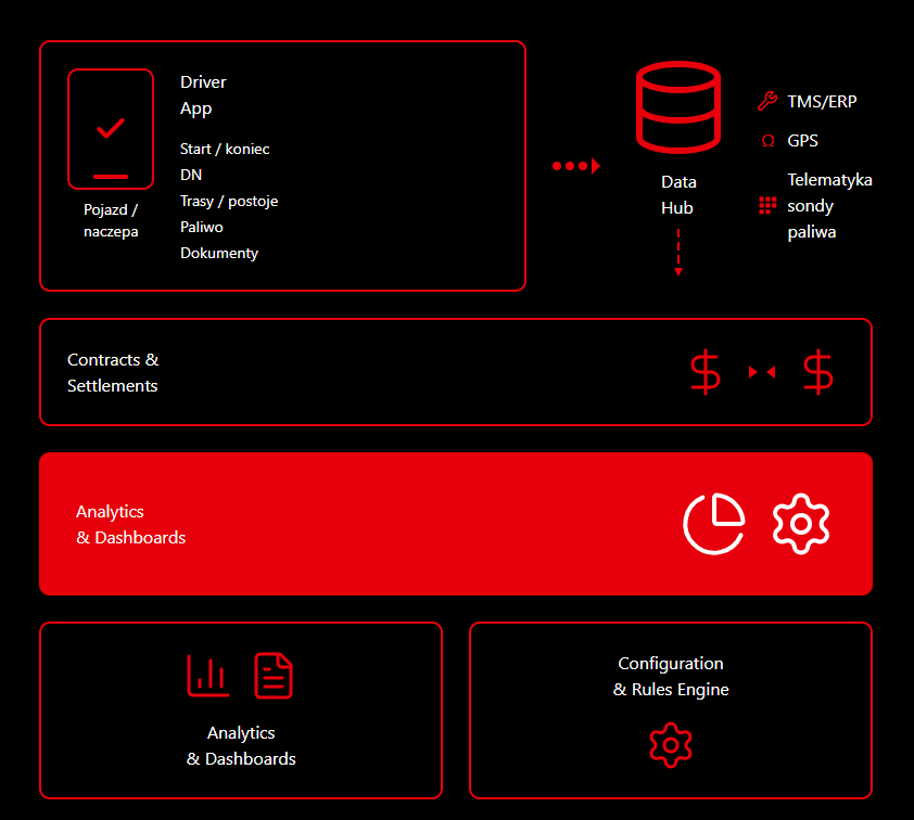 - Warstwa integracyjna (Data Hub) – odpowiada za zbieranie i synchronizację danych z systemów telematycznych, czujników paliwa oraz liczników pojazdów. Mechanizm mapowania i walidacji danych eliminuje błędy wynikające z różnic w formatach i częstotliwości pomiarów.