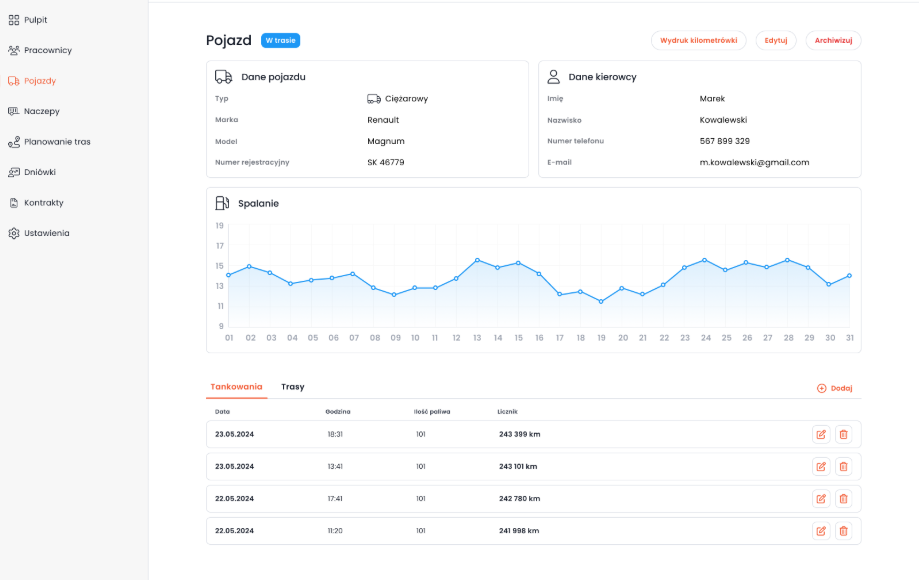 - Pełna przejrzystość zużycia paliwa – każde tankowanie jest automatycznie przypisywane do dniówki i kontraktu, co umożliwia szybkie wykrywanie anomalii, rozbieżności i potencjalnych strat paliwa.